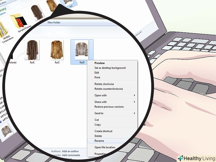 Назвіть кожне фото.з тих пір, як комп'ютерні програми дозволяють використовувати одне ім'я тільки один раз, додавайте до кожного імені цифру. Наприклад,» шоколадно-коричнева норкова шуба 1 «і»шоколадно-коричнева норкова шуба 2".