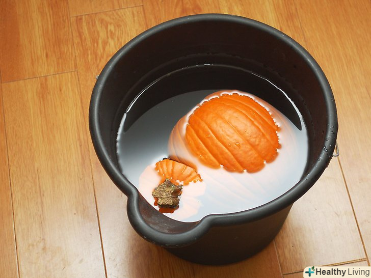 Помістіть свою вирізану гарбуз у ванну або велику ємність з холодною водою, вирізаною стороною вниз. дозвольте їй вбирати воду, протягом, щонайменше, 1 години; однак, ви можете залишити її у воді на не більше ніж 8 годин. Це допоможе вашій гарбузі стати більш твердою і чинити опір зневодненню довше, ніж необроблена гарбуз. Повністю висушіть гарбуз після обробки.- Це додасть міцності гарбузі, яка буде протистояти зневодненню довше необробленої гарбуза. Висушіть гарбуз повністю після замочування.
