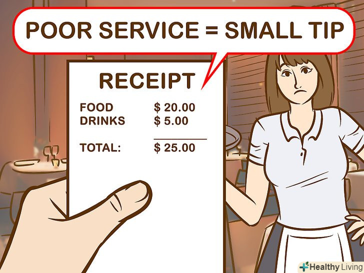 - Можливо, ви захочете пояснити відсутність чайових в рахунку, коли сплатите чек, ввічливим тоном і конструктивними пропозиціями. Деякі вважають, що ви все одно повинні залишити персоналу, принаймні, 10%, навіть якщо обслуговування було поганим.[6]