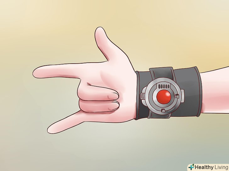 Змайструєте пару саморобнихПускачів павутини . намалюйте контури пускачів павутини на аркуші чорного або сірого фоамірана, також накресліть там же 12-16 прямокутників розміром 3 х 2 см, які будуть необхідні для створення кріпильних браслетів для пускачів. Викрийте деталі і склейте їх між собою гарячим клеєм. Наклейте на кінці отриманих браслетів застібки велкро, щоб ви могли закріплювати пускачі павутини на зап'ястях.[15]- Щоб піти далі з детальним опрацюванням аксесуара, приготуйте два відрізки від чорної трубочки для коктейлів довжиною по 2,5 см і наклейте їх на пускачі павутини, тим самим зімітувавши сопла, через які виходить павутина.