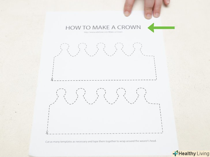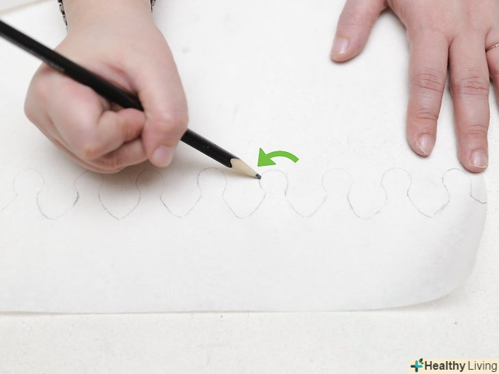 Зробіть шаблон.Візьміть великий аркуш паперу і розріжте його відповідно до проведених вимірювань. Проведіть горизонтальну лінію через лист, на відстані 2,5-5 сантиметрів від його нижнього краю. Це буде нижній край корони. Над лінією накресліть форму корони. Вона може бути будь-який, на ваш розсуд — зигзагоподібної, хвилястою або навіть з великим трикутником в центрі. Після цього виріжте намальований шаблон.- Щоб корона була симетричною, зігніть аркуш навпіл по вертикалі. Накресліть шаблон так, щоб центр корони знаходився в місці згину, після чого виріжте його.