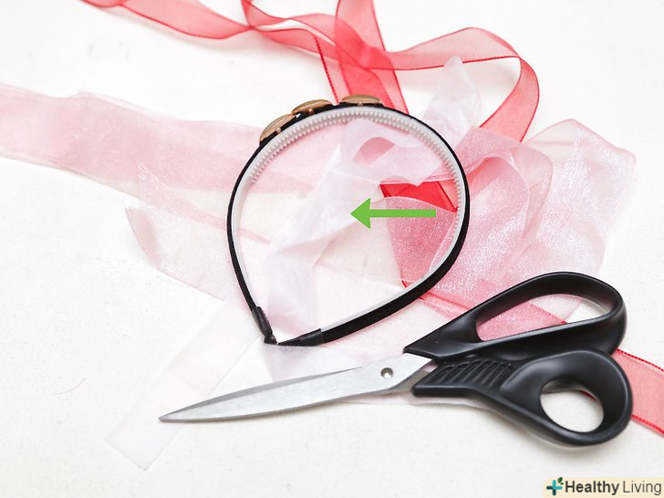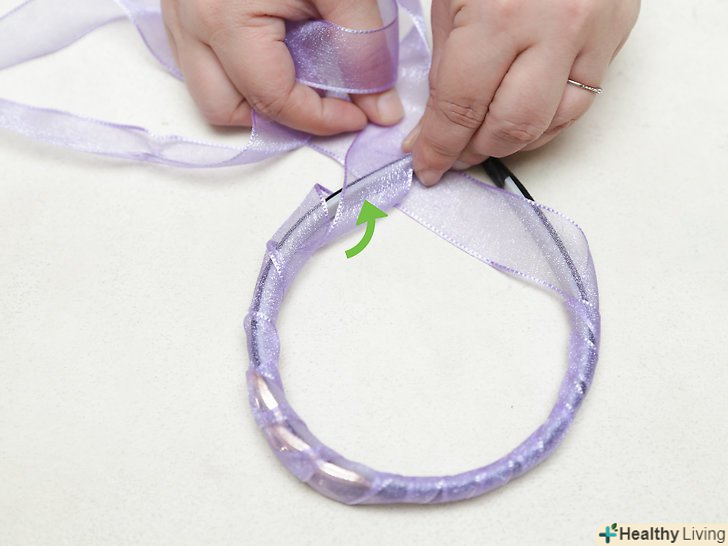 Подумайте про те, щоб обмотати головну пов'язку стрічкою.Так ви легше зможете приклеїти корону до пов'язки. Нанесіть краплю гарячого клею на один край пов'язки і притисніть до нього кінець стрічки. Потім обмотайте стрічку навколо пов'язки, так щоб кожен наступний виток злегка накладався на попередній. Коли ви дійдете до другого краю пов'язки, обріжте зайву стрічку і закріпіть її за допомогою гарячого клею.- Підійде стрічка шириною 0,5-1,5 сантиметра.