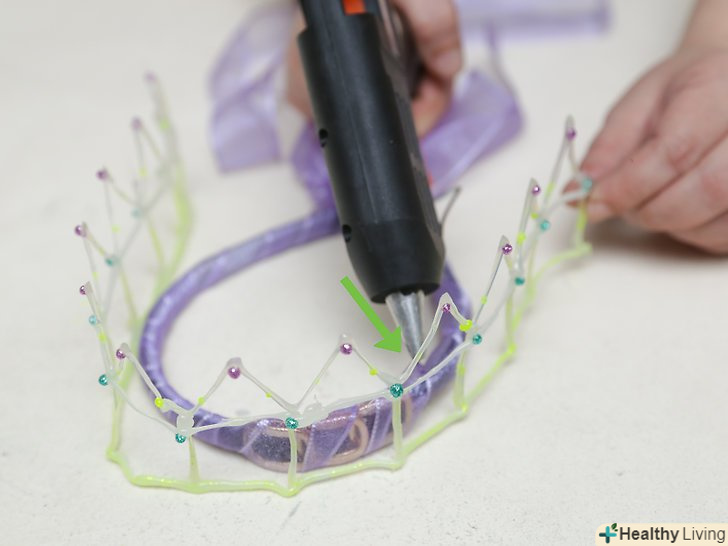 Пройдіться по заготівлі клейовим пістолетом (термопістолетом).можна використовувати як звичайний, так і блискучий гарячий клей. Нанесіть на корону 2-3 шари гарячого клею, щоб надати їй достатню товщину і міцність.- Обов'язково проведіть пряму лінію вздовж нижнього краю корони. Це допоможе склеїти корону. По цій лінії корона буде з'єднуватися з головною пов'язкою.