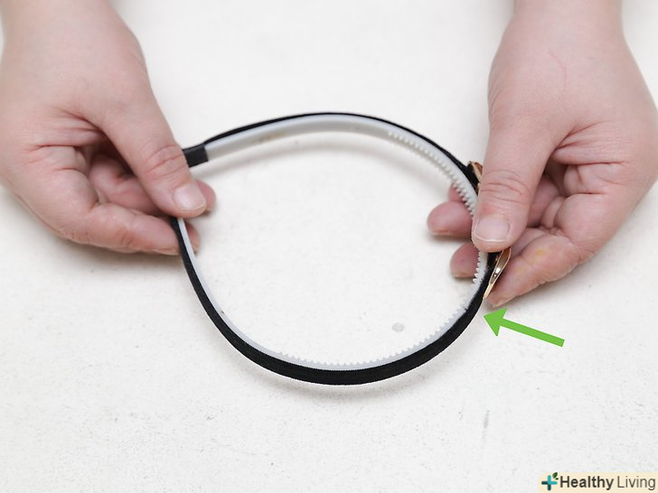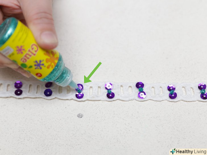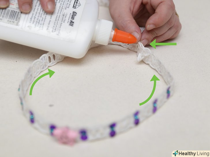 Згорніть тасьму кільцем і скріпіть її краю клеєм.накладіть один край на інший (або так, щоб поєдналися крайні виступи тасьми) на 1-2 сантиметри. Нанесіть в місці перетину смужку клею і скріпіть краю тасьми. Можна використовувати гарячий клей або клей для тканини. Якщо Ви користуєтеся клеєм для тканини, можна скріпити краю шпильками, поки клей не висохне.