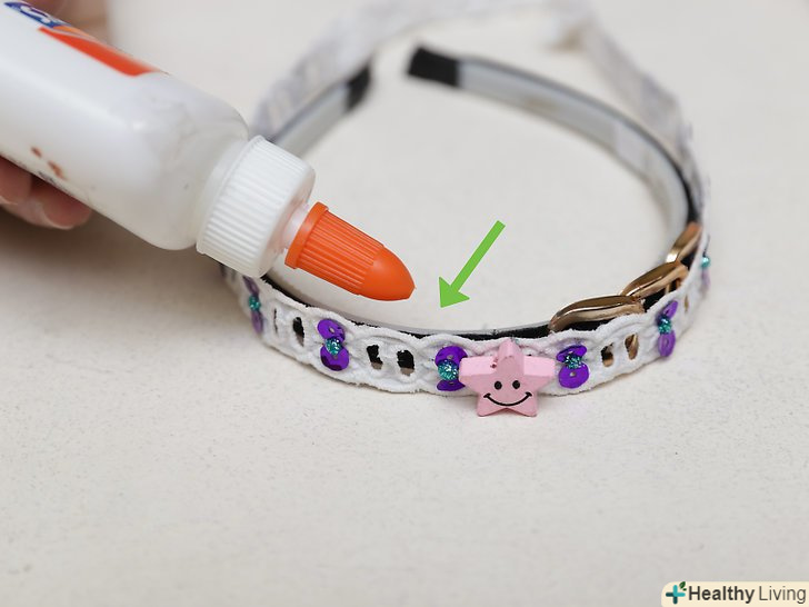 Подумайте про те, щоб наклеїти корону на головну пов'язку або обруч для волосся.якщо ви зробили мініатюрну корону, вона погано буде триматися на голові сама по собі. Проте, таку корону можна носити, якщо прикріпити її до головної пов'язки або обруча для волосся. Візьміть пов'язку або обруч і нанесіть на нього пару крапель клею; ці краплі повинні бути такої ж ширини, як і ваша корона. Притисніть нижній край корони до клею. При цьому стежте, щоб корона зберегла свою круглу форму.- Після того як клей висохне, можна пришити корону до пов'язки або обруча, щоб вона краще трималася.