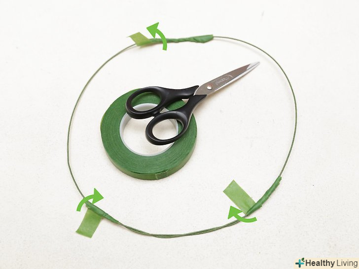 Подумайте про те, щоб обмотати флористичним скотчем весь дріт.почніть з місця стику і обкрутіть скотчем дріт. При цьому намагайтеся, щоб кожен наступний виток скотча злегка накладався на попередній. В результаті корона вийде більш міцною. Крім того, так вам буде легше прикріпити до дроту квіти.