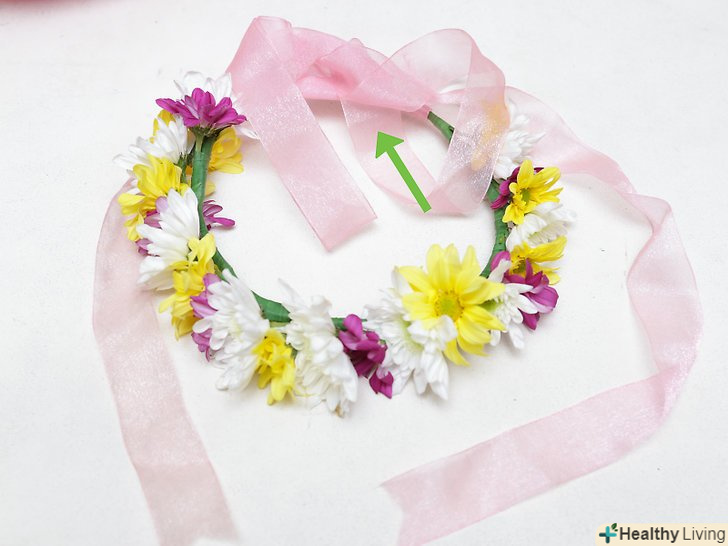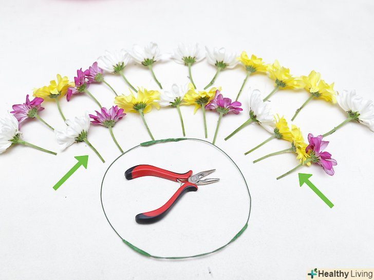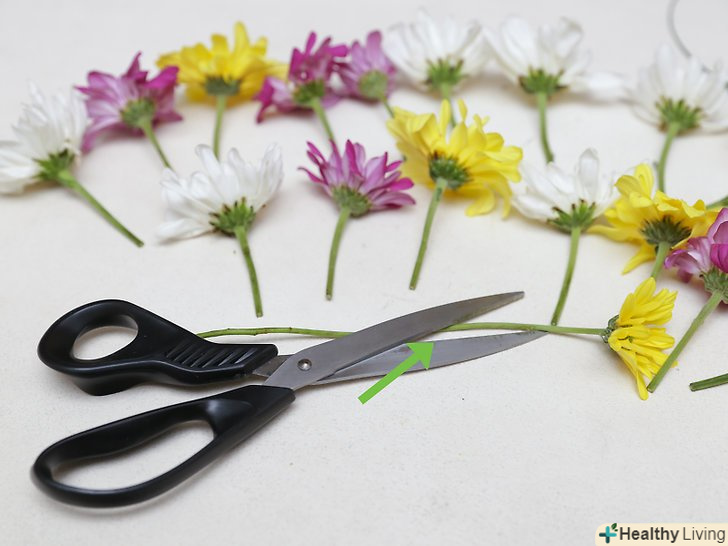Візьміть штучні квіти з тканини і обріжте стебла.залиште у квіток стебла довжиною 2,5-5 сантиметрів. Вони знадобляться, щоб прикріпити Квіти до корони. Стебла штучних квітів зручно обрізати кусачками, так як всередині них, як правило, розташована дріт.- Можна залишити також кілька листків. Вони зроблять корону густішою.