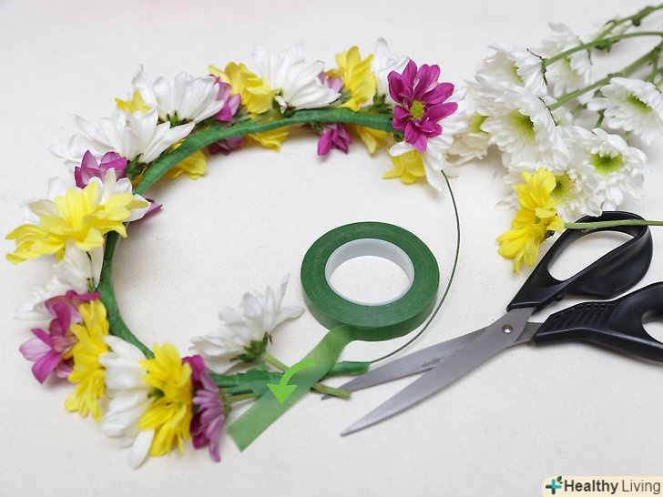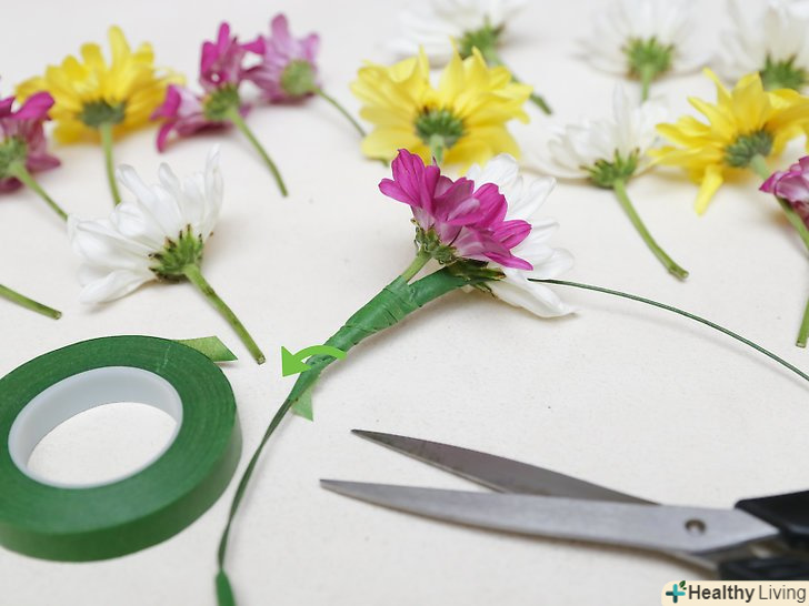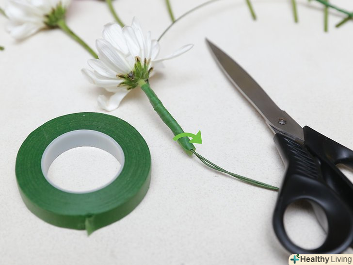 Прикріпіть до корони першу квітку за допомогою флористичного скотча.візьміть першу квітку і прикладіть його до дроту так, щоб стебло був спрямований уздовж неї. Обмотайте стебло і дріт зеленим флористичним скотчем. Накладіть скотч так,щоб він на 1-1, 5 сантиметра зайшов за край стебла.