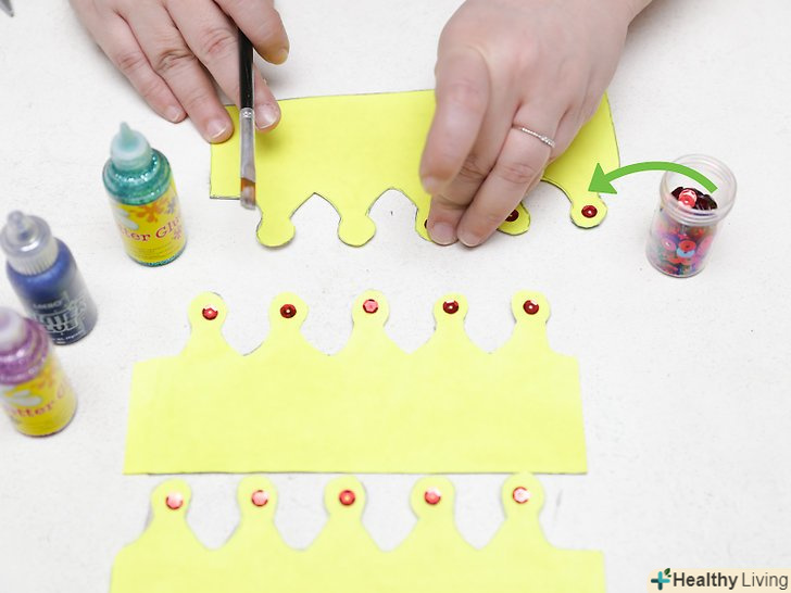 - Прикріпіть до корони штучні дорогоцінні камені за допомогою гарячого клею або клею для тканини.
