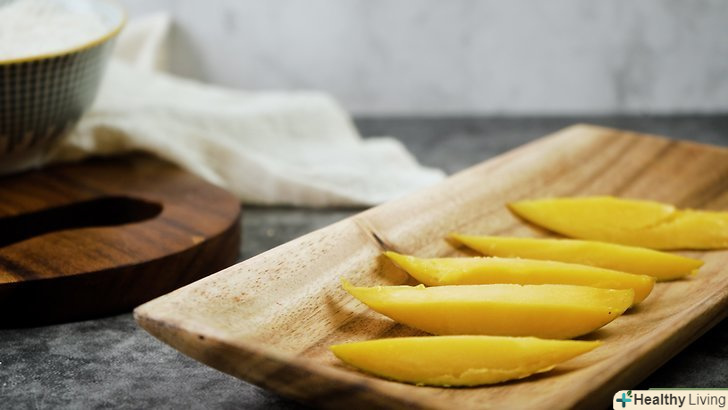 Підготуйте манго. Спочатку очистіть плід від шкірки. Якщо манго досить стигле, можна надрізати шкірку ножем і зняти її. Після того як ви очистите манго від шкірки, розріжте його навпіл і дістаньте кісточку. Потім наріжте манго тонкими скибочками. Візьміть ще два плоди манго і виконайте з ними те ж саме.
