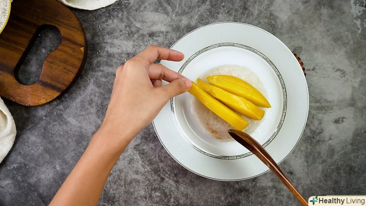 Розкладіть скибочки манго.їх можна помістити поруч з рисом або покласти поверх нього. Якщо ви кладете манго поверх рису, розташуйте скибочки у вигляді віяла.- Полийте скибочки манго і рис соусом.при бажанні можна також посипати соус дрібкою насіння кунжуту.