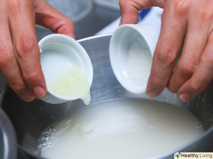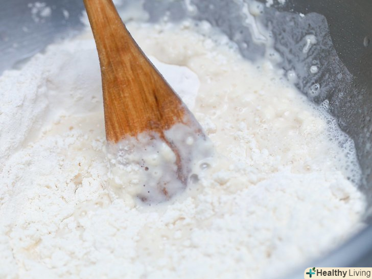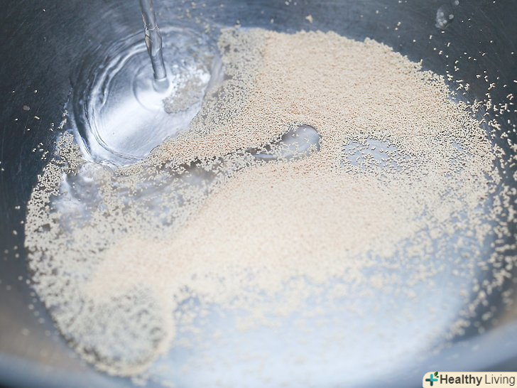 Змішайте сухі дріжджі і воду.використовуючи весь пакет дріжджів, розмішайте їх в 1 ½ склянки води. Залиште дріжджі протягом 2-5 хвилин.- Щоб змішати дріжджі, використовуйте теплу воду, але не холодну (яка може сповільнити процес) і не гарячу (яка може вбити дріжджі).