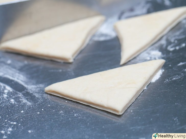 Розріжте тісто на трикутники.сформуйте тісто у формі великого прямокутника, потім розріжте по діагоналі, щоб вийшли невеликі трикутники. Намагайтеся, щоб найдовша сторона трикутника була менше 7.5 см.