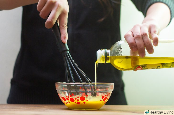 Повільно додайте в суміш оливкову олію, не перестаючи збивати.змішуйте протягом 5 хвилин, щоб досягти однорідної консистенції. Повільно додайте воду в міру того, як суміш стає все більш густий, для досягнення потрібної консистенції.