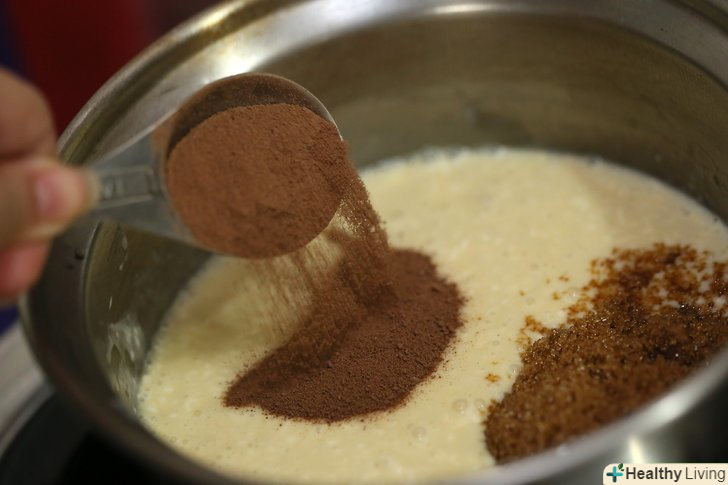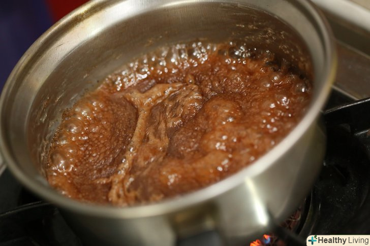 Продовжуйте готувати рідину, поки вона не почне кипіти, приблизно 2 або 3 хвилини. Зніміть каструлю з вогню.- Якщо можете, переконайтеся, що температура рідини не перевищує 115° C. Це буде гарантувати, що гарячий шоколад не схопиться і не затвердіє. Точка кипіння цукру відома як м'яке кипіння.[2] якщо температура рідини перевищує 115° C, то це вже сильне кипіння і при цьому цукор твердне. Для гарячого шоколаду це не ідеально.