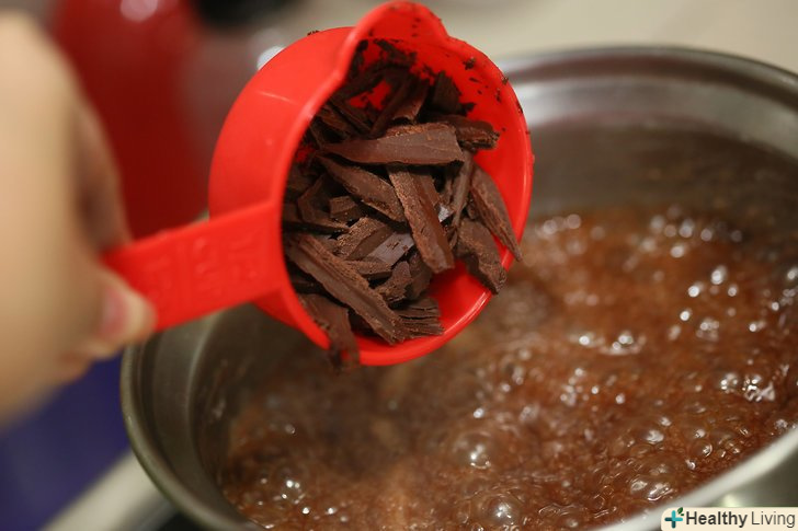 Додайте жирні вершки і сироп в сотейник і змішайте на середньому вогні.сироп, який додається в цьому рецепті, запобіжить затвердіння гарячого шоколаду при його попаданні на що-небудь холодне, наприклад, морозиво.[1] якщо ви вирішите, що хочете, щоб ваш гарячий шоколад затвердів при попаданні на холодне морозиво, замініть сироп цукром, або спробуйте повністю виключити сироп для менш солодкого гарячого шоколаду.- Ви можете вибрати золотий або кукурудзяний сироп. Золотий сироп готується з цукрової тростини, тим часом, як кукурудзяний сироп готується з – ви вгадали-кукурудзи. У золотого сиропу багатший, комплексний аромат, ніж у кукурудзяного сиропу, хоча він коштує дорожче. В Америці більшість кукурудзяних сиропів генетично модифіковані.