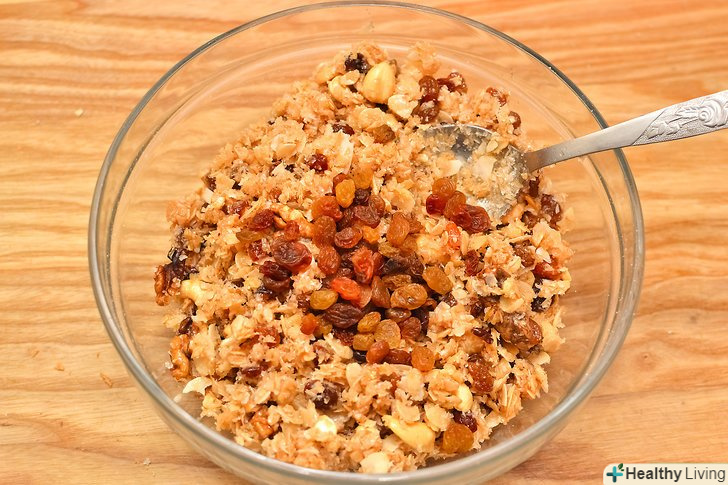 Дістаньте гранолу з духовки, перемістіть у велику миску і дайте охолонути.додайте родзинки або інші сухофрукти на ваш вибір і перемішайте.