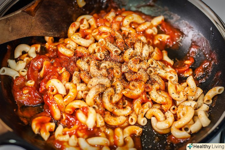 Додайте макарони, посоліть, поперчіть і ретельно перемішайте.помішуючи, залиште на слабкому вогні ще на кілька хвилин, а потім вимкніть вогонь.
