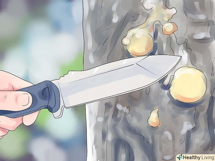 Зішкребіть з дерева застиглу смолу.для цього добре підійде складаний ножик. Збирайте шматочки смоли в невеликий контейнер або руку.