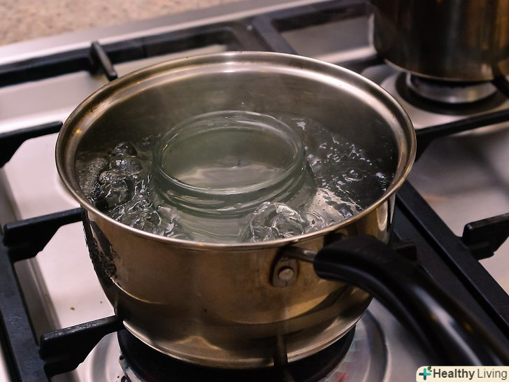 Закрийте банки і поставте їх в каструлю з киплячою водою.поставте банки у велику каструлю з водою. Дивіться, щоб банки були повністю занурені в воду, і щоб над ними було хоча б 5 см води. Кип'ятіть їх протягом п'яти хвилин, після чого щипцями дістаньте банки з води.[14]- Коли ви дістанете банки з води, то побачите невелику вм'ятину на кожній кришці. Це означає, що банки герметичні і їх можна зберігати півтора року!