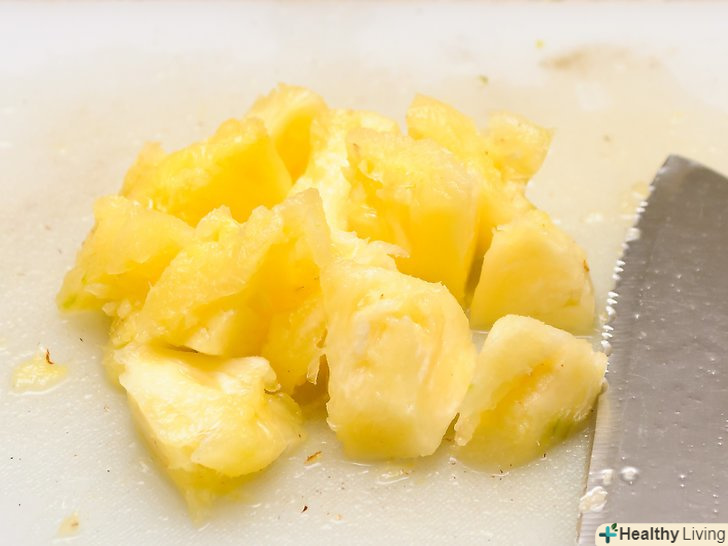 Поріжте ананас на невеликі шматочки.розріжте ананас на невеликі кубики (близько 2 см). Кубики не обов'язково повинні бути рівними, оскільки їх все одно доведеться потім подрібнювати. Просто переконайтеся, щоб їх можна було висипати в кухонний комбайн або блендер.[2]- Виріжте будь-які вузлики і насіння, які вам попадуться при обробленні ананаса.