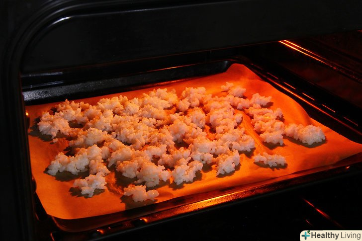 Обсушити рис в духовці при температурі 120 °C протягом 2 годин.Розігрійте духовку і поставте деко з рисом в неї відразу, як тільки вона нагріється. Сушіть рис в духовці при цій низькій температурі приблизно 2 години — за цей час з рису повинна випаруватися вся зайва волога. Коли рис висохне, дістаньте його з духовки і вимкніть її.[4]- Рис повинен бути абсолютно сухим і твердим, коли ви його дістанете.