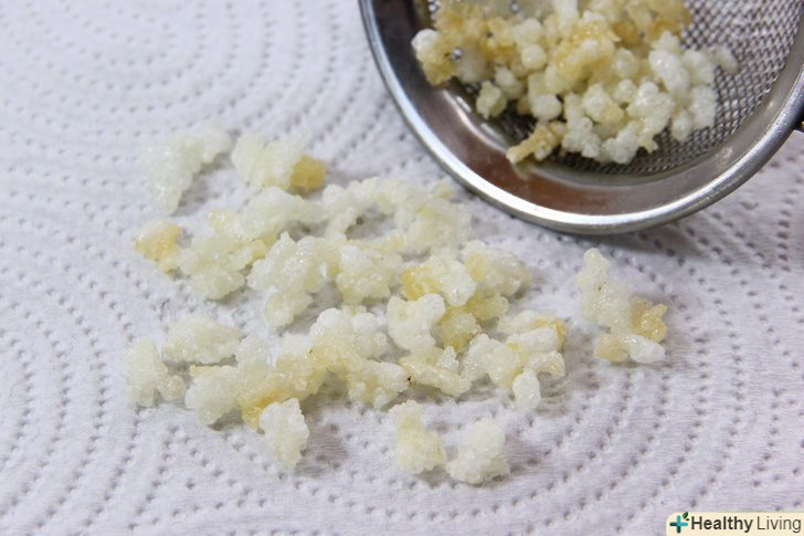 Додайте кілька зерен рису, щоб перевірити температуру масла.як тільки масло нагріється до 190 °C, киньте кілька зерен рису в каструлю, щоб переконатися, що температура досить висока, але при цьому не надто висока, щоб рис не згорів. Рисові зернятка повинні лопатися відразу ж, якщо масло має потрібну температуру.[6]- Якщо рис надувається більш ніж за 10-15 секунд, дайте маслу ще часу нагрітися. При можливості перевіряйте його температуру кухонним термометром.
