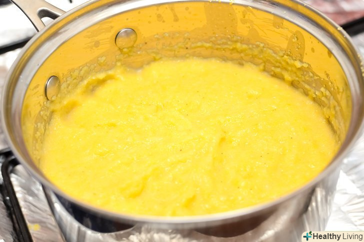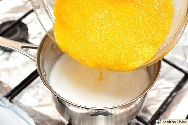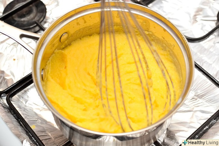 Зменшіть вогонь під каструлькою і додайте кукурудзяну суміш.постійно помішуйте кашу приблизно 3 хвилини віночком, щоб уникнути грудочок.- Якщо вогонь під каструлькою занадто великий, каша може розбризкатися.