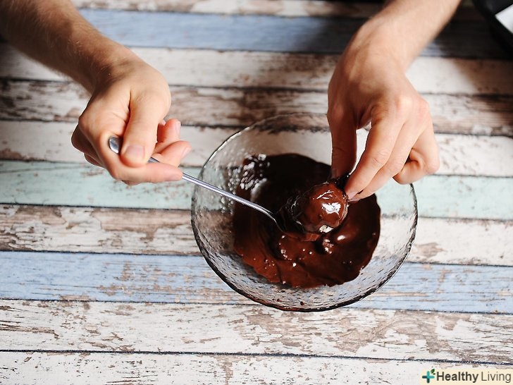 Занурте Кокосові цукерки в шоколад.після того, як кокосові цукерки застигнуть, занурте їх у розтоплений шоколад, а потім дозвольте стекти надлишкам. Викладіть цукерки в шоколадній глазурі на деко, покритий вощеним папером. При бажанні, можете посипати трошки подрібненого кокоса або мигдальної стружки зверху для прикраси. Перед вживанням, дайте шоколаду застигнути![2]