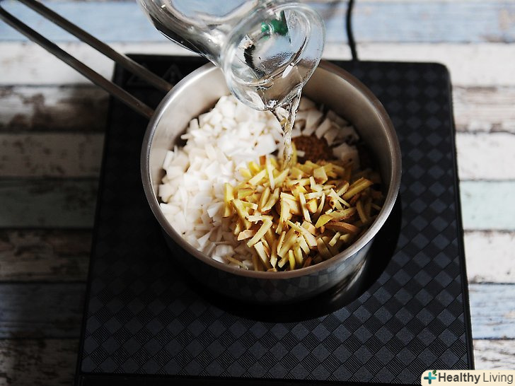 Змішайте всі інгредієнти в каструлі.змішайте кубики кокоса, нарізаний імбир, цукор і воду в каструлі з товстим дном і поставте її на середній вогонь.