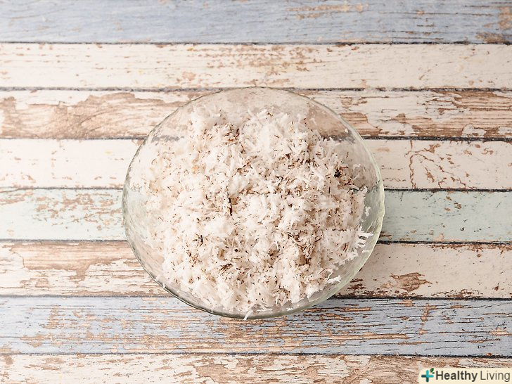 Підготуйте свіжий кокос.Візьміть свіжий коричневий кокос і використовуйте викрутку, щоб пробити дірки в «очках» горіха. Дайте витекти рідини з кокоса-використовуєте її або виливайте, на ваш розсуд!- Використовуйте молоток, щоб розкрити кокоси і ніж для масла, щоб відірвати кокосову основу від шкірки. Використовуйте овочевий ніж, щоб відокремити коричневий зовнішній шар від м'якоті, потім використовуйте ніж для нарізки кокоса.