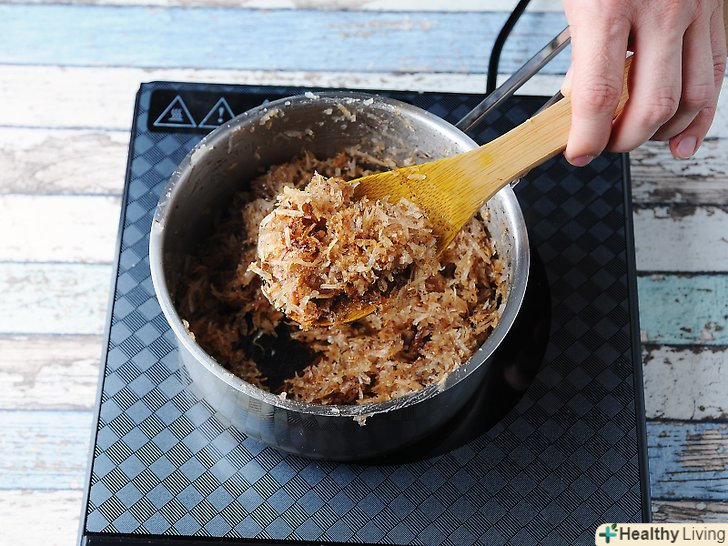Постійно помішуйте, поки шматочки кокоса не стануть коричневого кольору.коли цукор карамелізується, кокосова суміш стане більш щільною і кокосові частинки побуреют.- Як тільки це станеться, візьміть каструлю, зніміть з вогню і викладіть кокосову суміш на тарілку. Будьте обережні, щоб не торкатися до цукерок, так як вони будуть дуже гарячими!