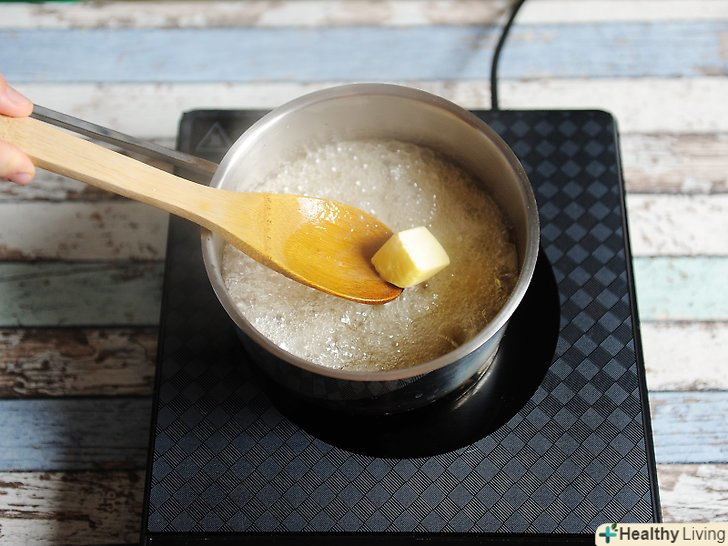 Додайте вершкове масло і продовжуйте варити.коли суміш досягне 60 градусів Цельсія, додайте вершкове масло і перемішуйте до тих пір, поки воно не розчинитися в суміші. Залиште покипіти (не перемішуючи), поки суміш не розігріється до 127 градусів Цельсія.