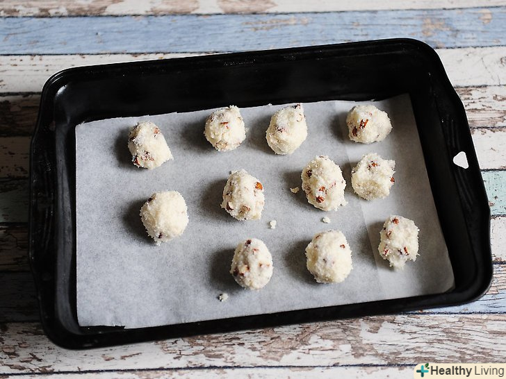 З'єднайте кокос, мигдаль, цукор і молоко.змішайте ці інгредієнти у великій мисці, поки вони не утворюють липку суміш.- Сформуйте з суміші кульки радіусом 2,5 см, а потім викладіть їх на змащений маслом лист для випічки і поставте в холодильник приблизно на 20 хвилин.