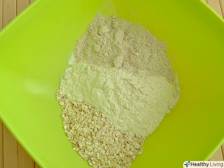 Помістіть в миску сухі інгредієнти рецепта.візьміть миску середнього розміру і перемішайте в ній борошно, вівсяні пластівці і зародки пшениці. У рецепті можна використовувати пшеничне борошно або борошно іншого виду на ваш розсуд.