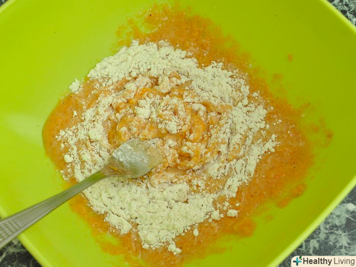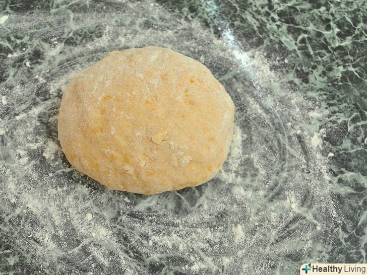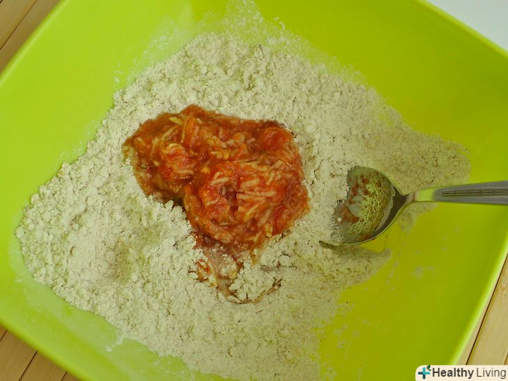 Поступово додавайте в суміш борошно.додавайте за один прийом по половині склянки борошна і кожен раз ретельно розмішуйте. Коли вже введете в суміш 2 ½ склянки борошна, додавайте більше тільки в тому випадку, якщо тісто все ще залишається липким. При цьому продовжуйте додавати борошно вже чвертями склянки, поки тісто не перестане липнути.- Для собак, чутливих до пшениці або з алергією на неї, спробуйте використовувати рис, нут, вівсянку, кіноа або борошно амаранту. Уникайте застосування кукурудзяного або соєвого борошна, так як собаки їх погано перетравлюють.[4]
