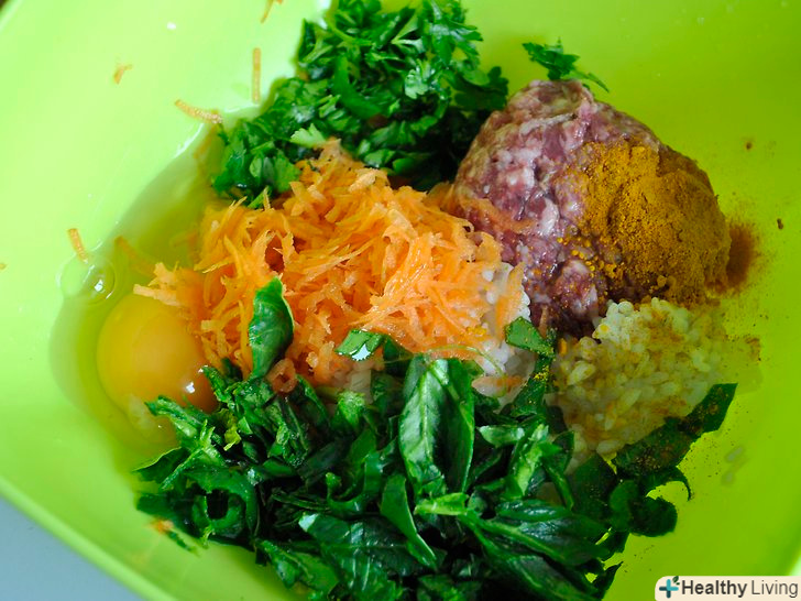 Змішайте всі інгредієнти.змішайте в мисці яловичий фарш, відварений рис, моркву, селеру, шпинат, петрушку, яйце і куркуму.[6] продовжуйте перемішувати інгредієнти до повного змішування.- Можна додати туди ж дві столові ложки сиру чеддер або пармезан, але пам'ятайте про те, що давати собакам молочні продукти не рекомендується, так як міститься в них лактоза може спровокувати блювоту, діарею і газоутворення.[7]