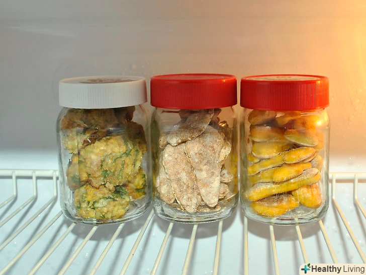 Для довгострокового зберігання заморозьте ласощі.можна виготовити більшу партію ласощі для собаки, а потім більшу її частину розкласти по герметичних контейнерах і прибрати в морозилку на термін аж до восьми місяців![9] Обов'язково розморожуйте ласощі, перш ніж давати його собаці.