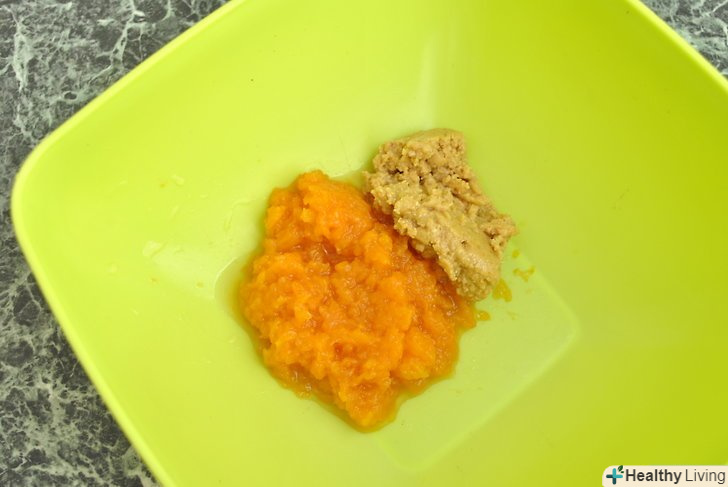 Додайте в миску гарбузове пюре, арахісове масло і два яйця.збивайте інгредієнти протягом 1-2 хвилин до повного змішування. Дуже важливо використовувати інгредієнти без цукру в складі, так як занадто велика кількість солодощів в собачому раціоні може призводити до тих же негативних наслідків для здоров'я, що і у людей, в тому числі до ожиріння і діабету.[2] щоб трохи урізноманітнити смак ласощів, можна зробити наступне:[3]- Частково або повністю замінити гарбузове пюре на пюре з батату;