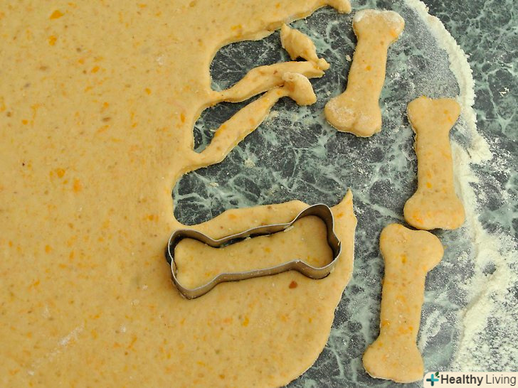 Наріжте печиво обраної вами формочкою.помістіть печиво на деко. Коли наріжете з пласта тіста максимально можливу кількість печива, зберіть залишки, знову скачайте їх в кульку, а потім розкачайте і виріжте ще більше печива. Якщо у вас немає формочки для нарізки печива, можна скористатися одним із запропонованих нижче варіантів.- Приготуйте звичайне печиво. Беріть порції тіста розміром зі столову ложку, скачуйте їх в кульки, а потім розплющуйте в коржі товщиною по 5 мм. Наліпіть печиво необхідної форми руками. Для традиційного собачого печива у вигляді кісточок візьміть порцію тіста розміром зі столову ложку і скачайте з неї циліндр. Сформуйте на кінцях циліндра потовщення, схожі на кісткові хрящі. Потім розплющте отриману кісточку до товщини в 5 мм.