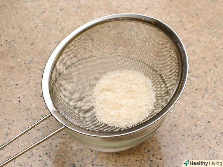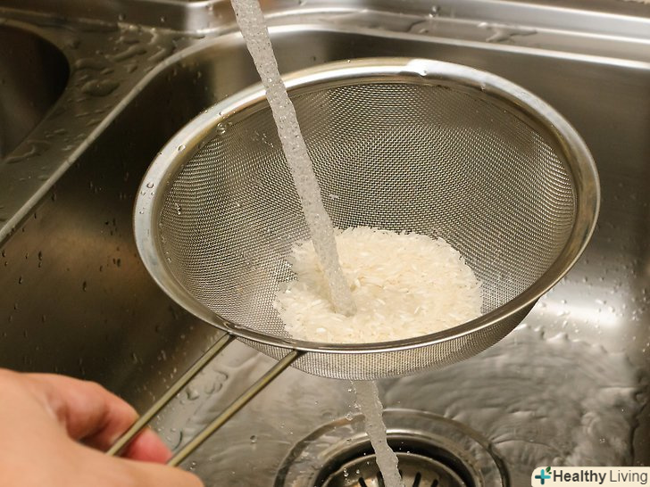 Промийте рис (необов'язково).додавання холодної води до рису і його стікання видалить крохмаль без втрати поживних речовин. Це призведе до розсипчастості рису, хоча розмелюють процеси залишають мало зайвого крохмалю для видалення.- Якщо у вас немає сита, просто нахиліть каструлю обережно, щоб тільки вода скла, використовуючи дерев'яну ложку, якщо це необхідно, щоб притримати рис.