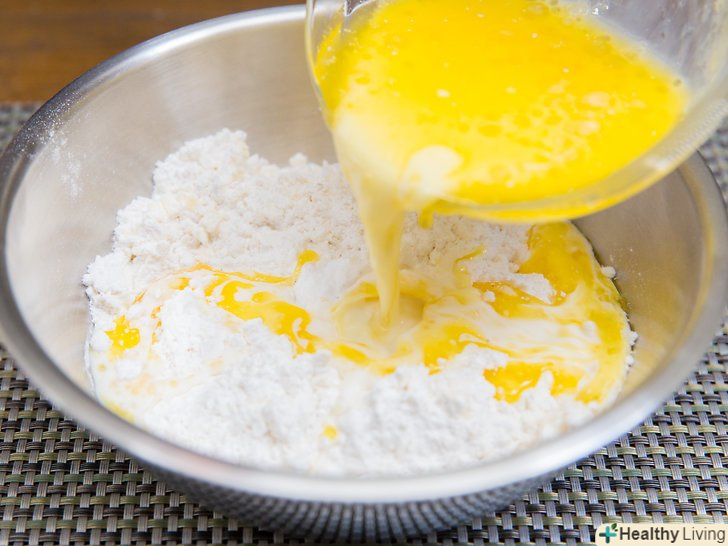 Додайте суміш пахти до суміші борошна.акуратно їх перемішайте до однорідної консистенції тесту. Слідкуйте, щоб не залишилося сухих інгредієнтів.