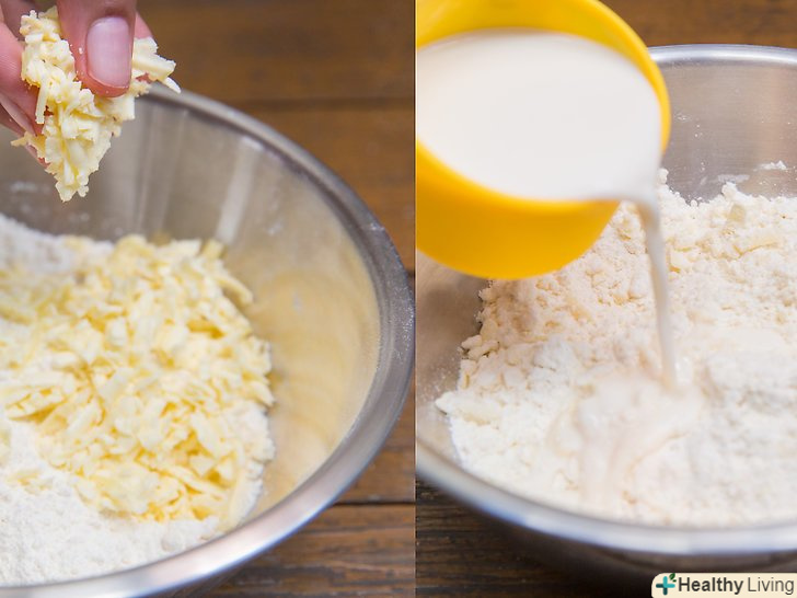 Додайте в суміш сир чеддер, молоко і часник.додайте 1 склянку тертого сиру чеддер, ¾ склянки холодного цільного молока і ¼ ч. л. часнику. Змішуйте інгредієнти вручну протягом приблизно 1 хвилини. Знову ж таки, не змішуйте надмірно.