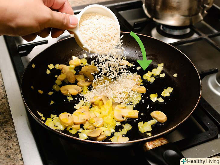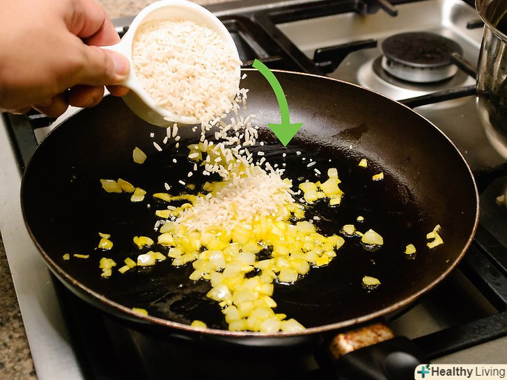 Насипте в сковороду 1,5 склянки рису арборіо. Змішайте його з цибулею. Обсмажте рис протягом однієї-двох хвилин, щоб він просочився ароматом цибулі.