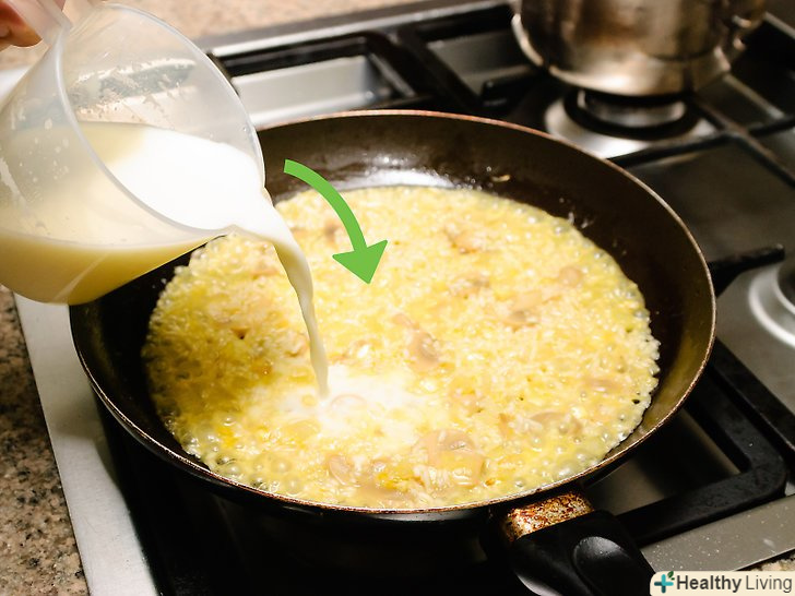 Додайте до рису черпаком одну або дві склянки киплячого бульйону.потім перемішайте рис, поки він не вбере бульйон. Продовжуйте додавати бульйон і перемішувати. Ця технологія допомагає рису випустити крохмаль, а самій страві стати вершкової текстури, яка є класичною для різотто. Додайте в різотто приблизно 3/4 бульйону.
