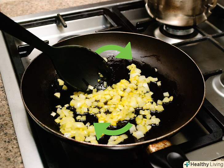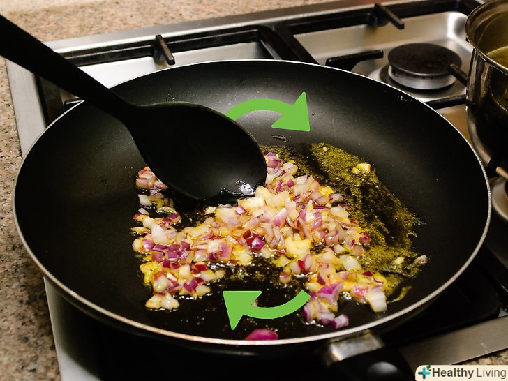 У важкій сковороді на середньому вогні обсмажте одну невелику нарізану білу цибулину в 2 ст.л. вершкового масла. Сковорода повинна бути місткістю 2-3 літри. Обсмажуйте цибулю, час від часу помішуючи дерев'яною ложкою, поки він не стане напівпрозорим.
