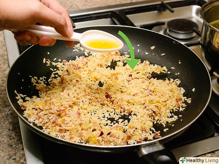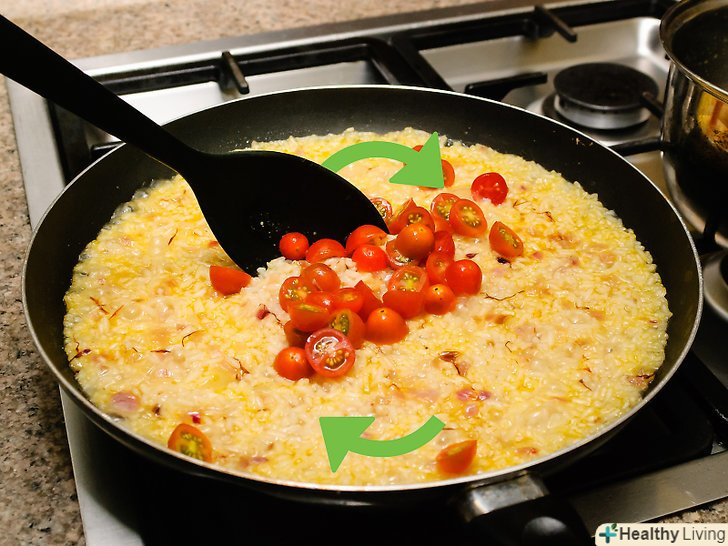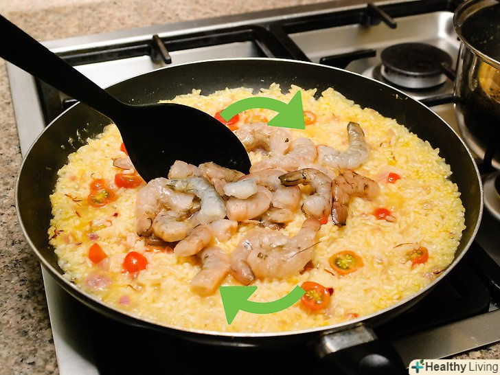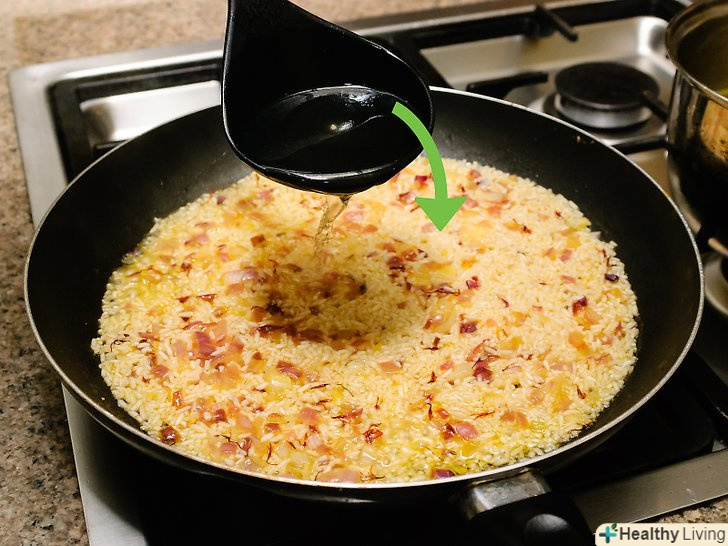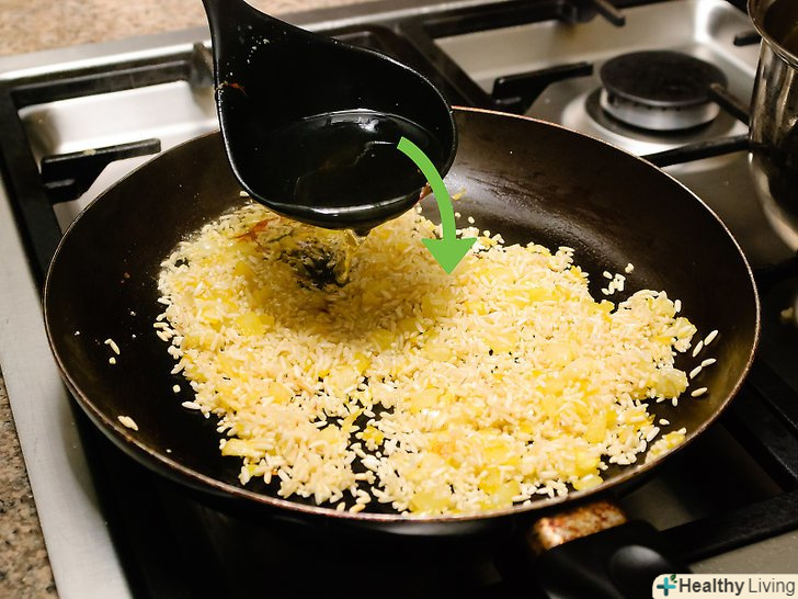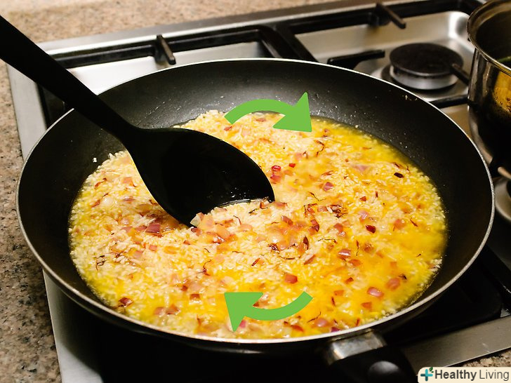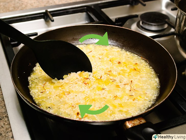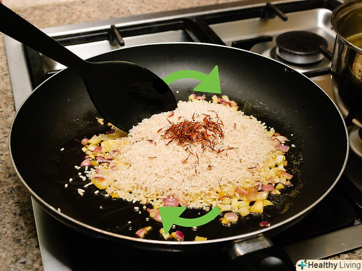 Додайте в сковороду 1/2 склянки сирого рису арборіо і 1/8 ч.л. шафрану. Готуйте протягом 30 секунд і постійно помішуйте інгредієнти.