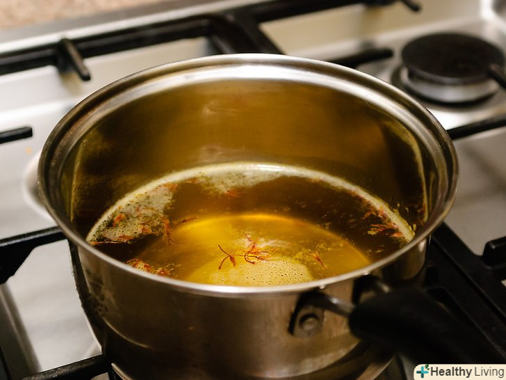 В окремій каструлі на середньому вогні розігрійте 3 склянки курячого бульйону.доведіть до легкого кипіння і додайте шафран.