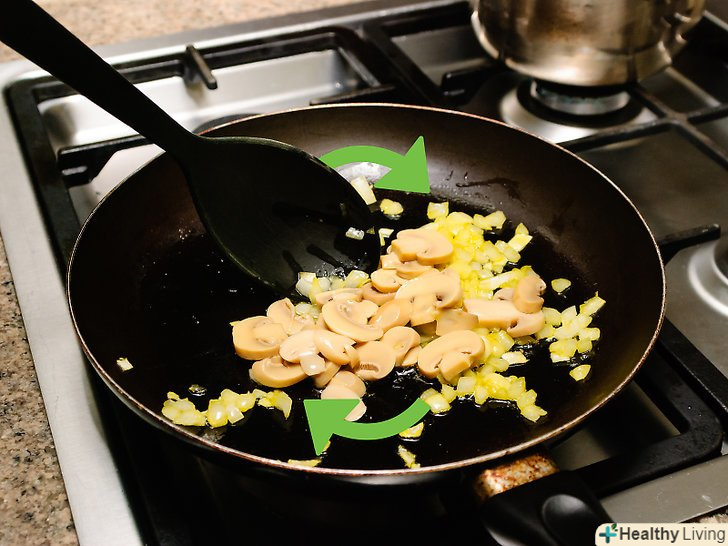 Покладіть в суміш 1 склянку нарізаних білих грибів.обсмажуйте, поки цибуля не карамелізується.