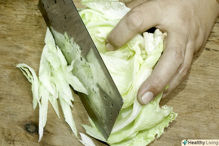Наріжте салат.нарізайте салат тільки вертикально, постійно нахиляючи половинку до тих пір, поки не наріжете його до кінця. Якщо вам не потрібні довгі смуги, просто розріжте вийшла жменьку навпіл горизонтально. Ви також можете нашаткувати салат смугами бажаної товщини, притиснувши плоский край до дошки.